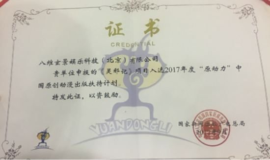 (图:《灵邪记》获2017年度“原动力”中国原创动漫出版扶持计划)