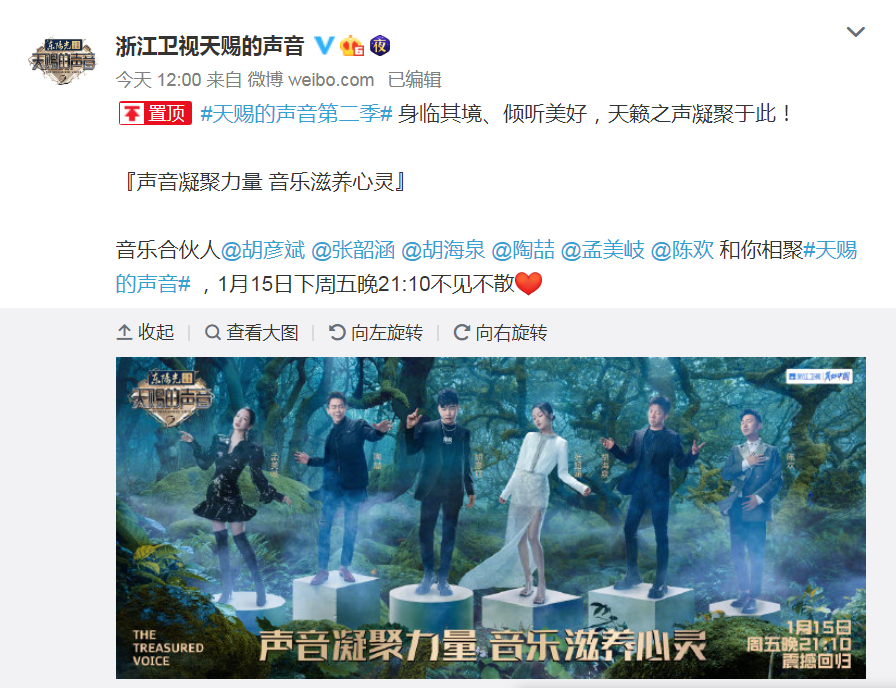 好消息!官博今天除了官宣嘉宾阵容,还将新一季节目的播出时间也一起公开了。据了解,《天赐的声音2》将于1月15日起,每周五晚上21:10在浙江卫视播出。