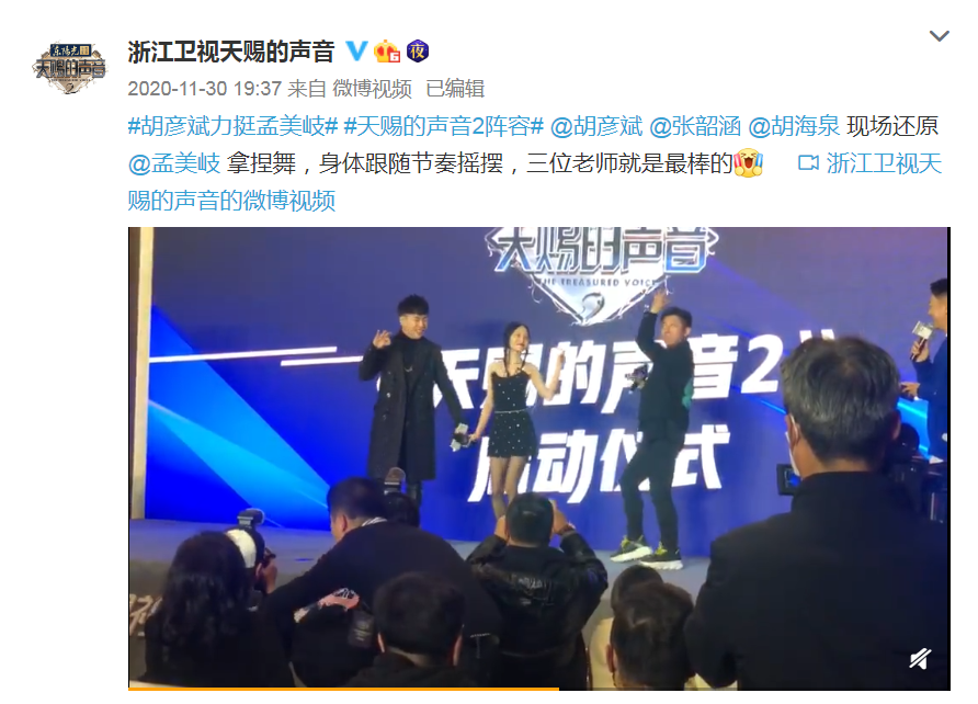 还记得一个月前《天赐的声音2》启动仪式吗?发布会当天,官博官宣了新一季的嘉宾中有胡彦斌、胡海泉、张韶涵、孟美岐等人,胡彦斌还力挺“爱徒”孟美岐,带着另外两位合伙人,现场在舞台上跳起了孟美岐的拿捏舞。