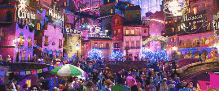 in this telling, the land of the dead is not a fearsome place, but rather a never-ending skeleton party conducted in a glorious multi-tiered city that rises from sea-level houseboats to vast, imperious towers inhabited by celebrities such as de la cruz—all of them connected by arched bridges and aerial trams.