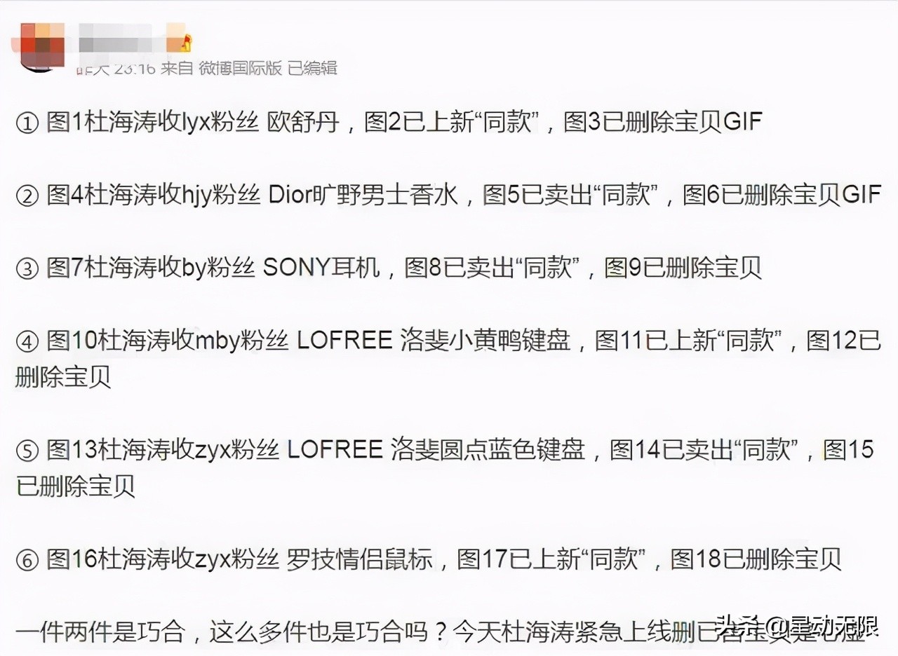 经过网友根据录屏删除的商品做对比,发现杜海涛删除的礼物,有几样和粉丝《快乐大本营》应援记录对上了。