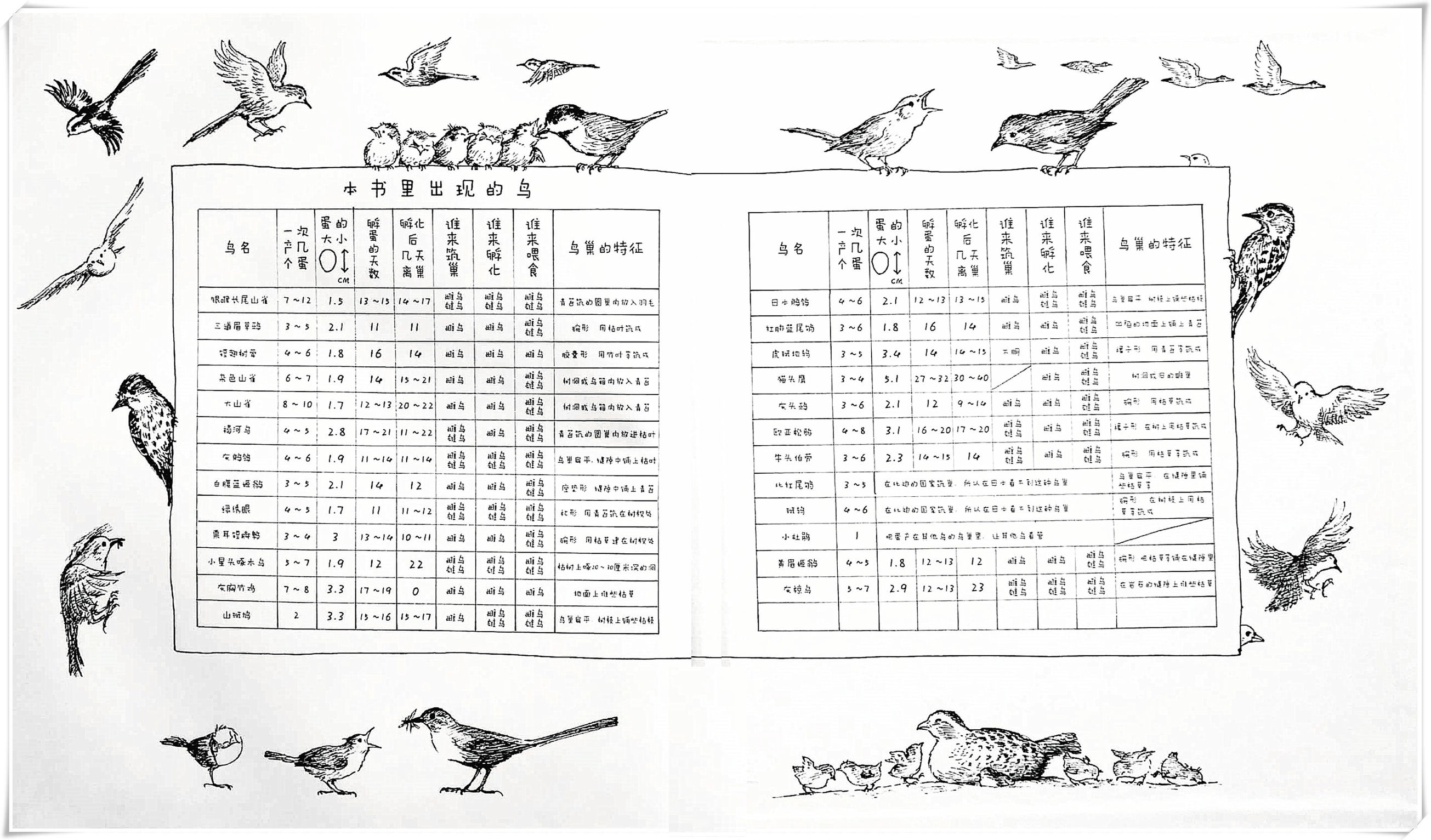 书里记录下这些鸟儿的生活轨迹,我们一起来看一看后环衬。铃木守记录得太详细了。连鸟儿一次产几个蛋都有记录,观察细致。作者一定是每天都在观察,只有坚持才能记录得这么准确。