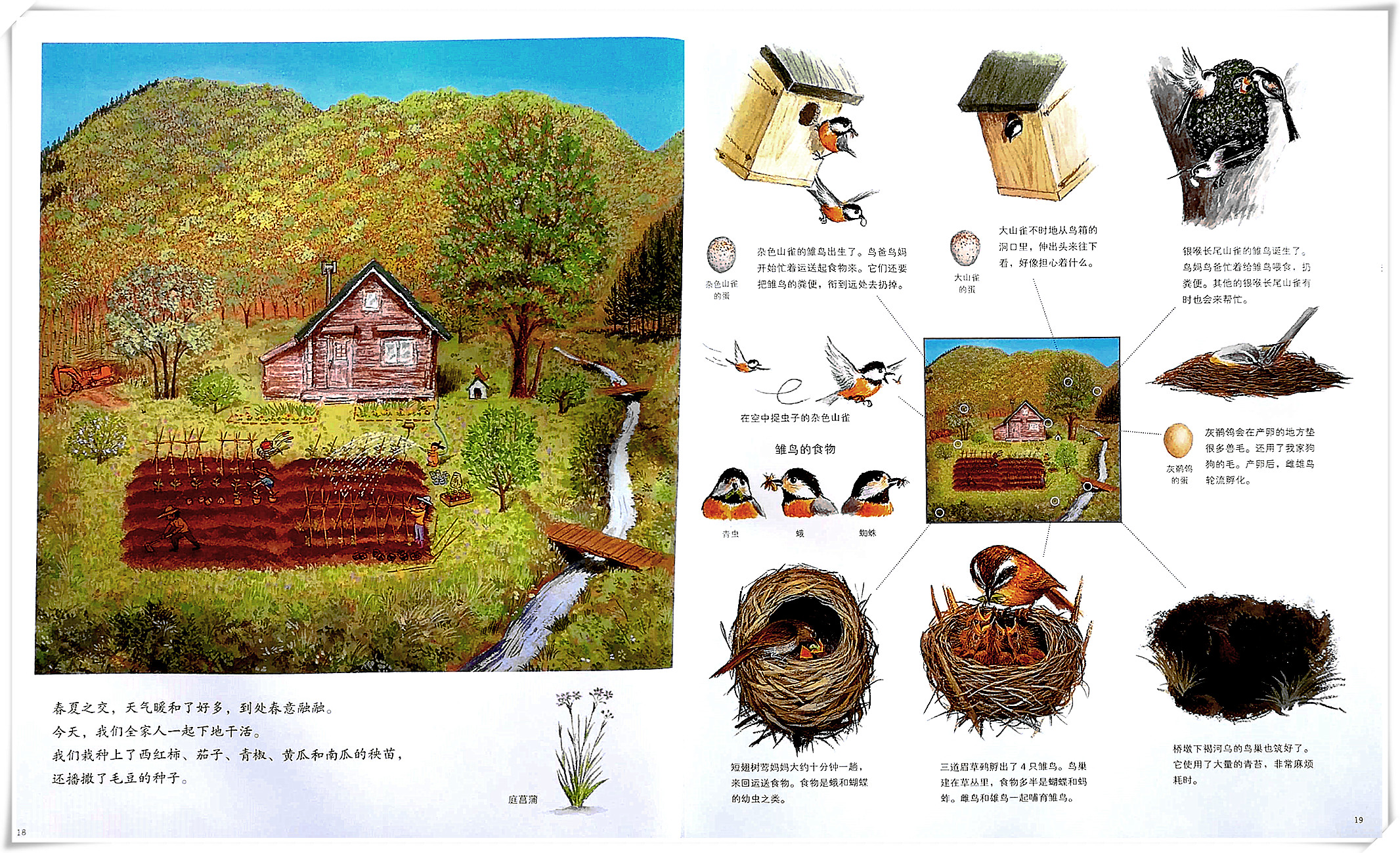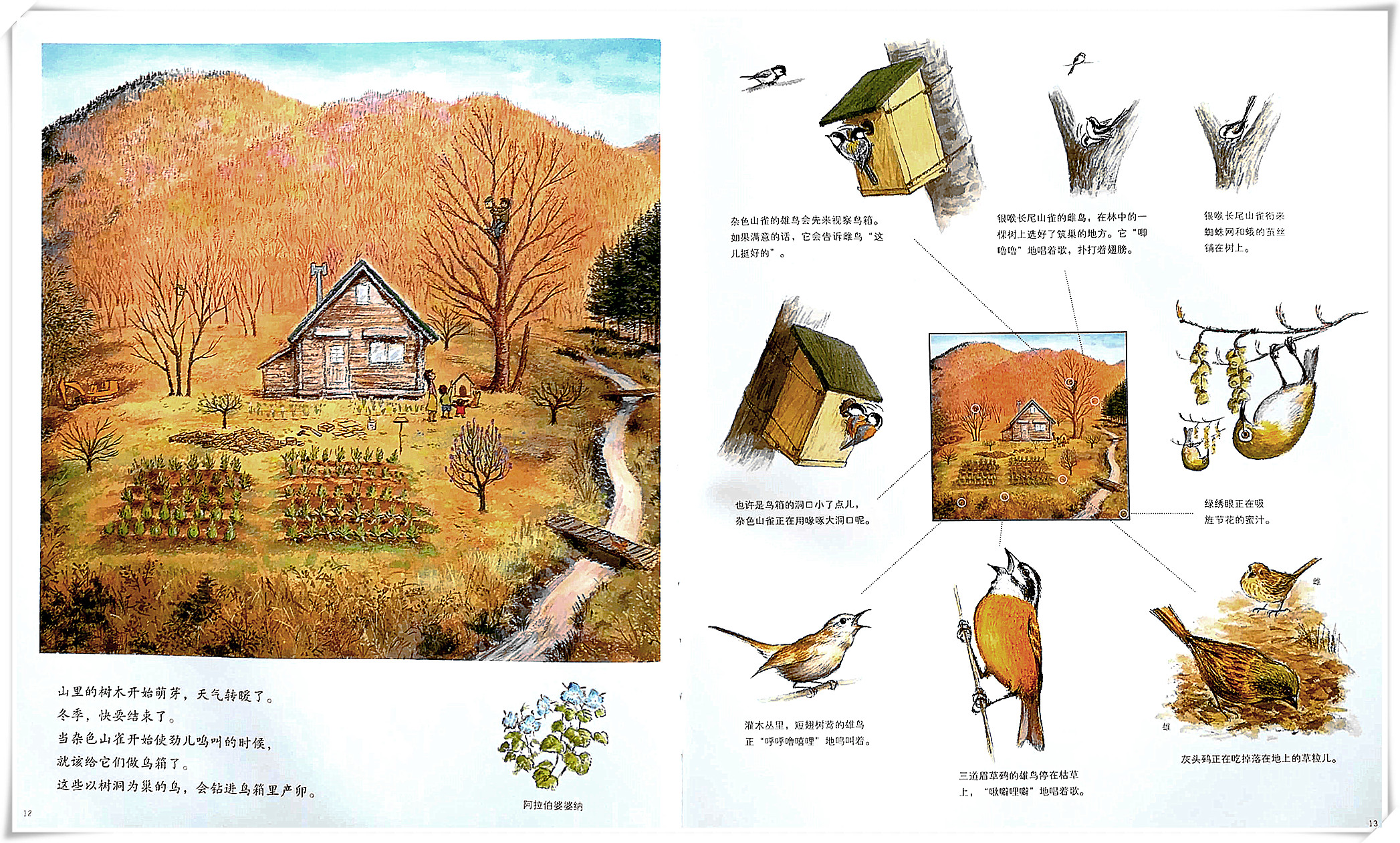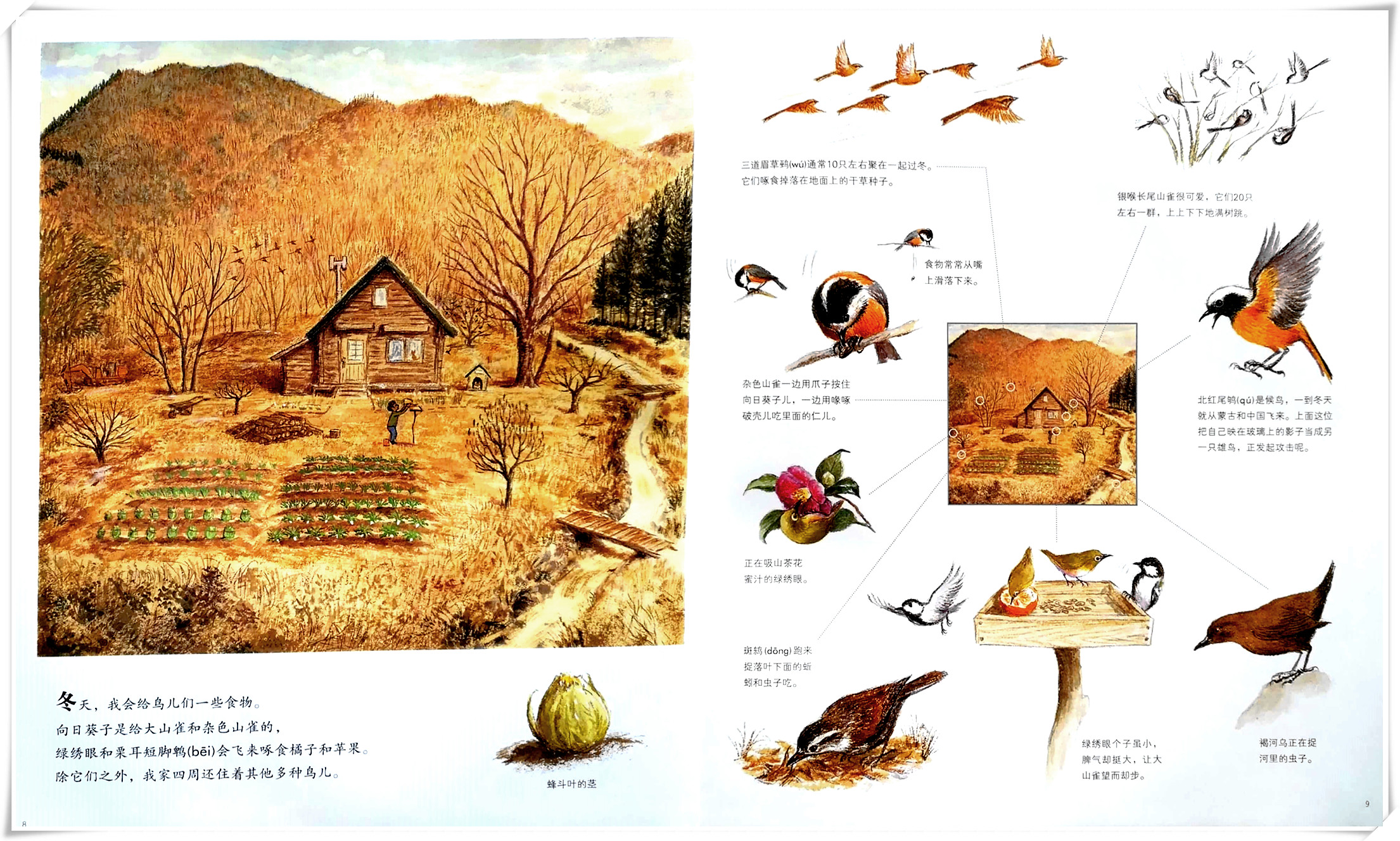 纵观全书采用相同结构,左侧画面为作者一家生活的大图和文字部分,同时选一有代表行的小鸟、果蔬或草药放大说明。如本页中的蜂斗菜,就是中草药。蜂斗菜的根茎及全草,具有清热解毒,散瘀消肿之功效。用于咽喉肿痛,痈肿疔毒,毒蛇咬伤,跌打损伤。右侧以缩小的左侧画面为中心,进行不同季节遍布周围的鸟类习性的介绍,并用虚线和白圆圈指明鸟的位置。作者很用心,小小鸟在画面中往往只是一个小黑掉,又如何引起读者的注意呢!在作者的指引下,读者能找到小鸟的存在吗!如果没有这份导图你又能够在大图中悉数能看到吗!不妨试一试!