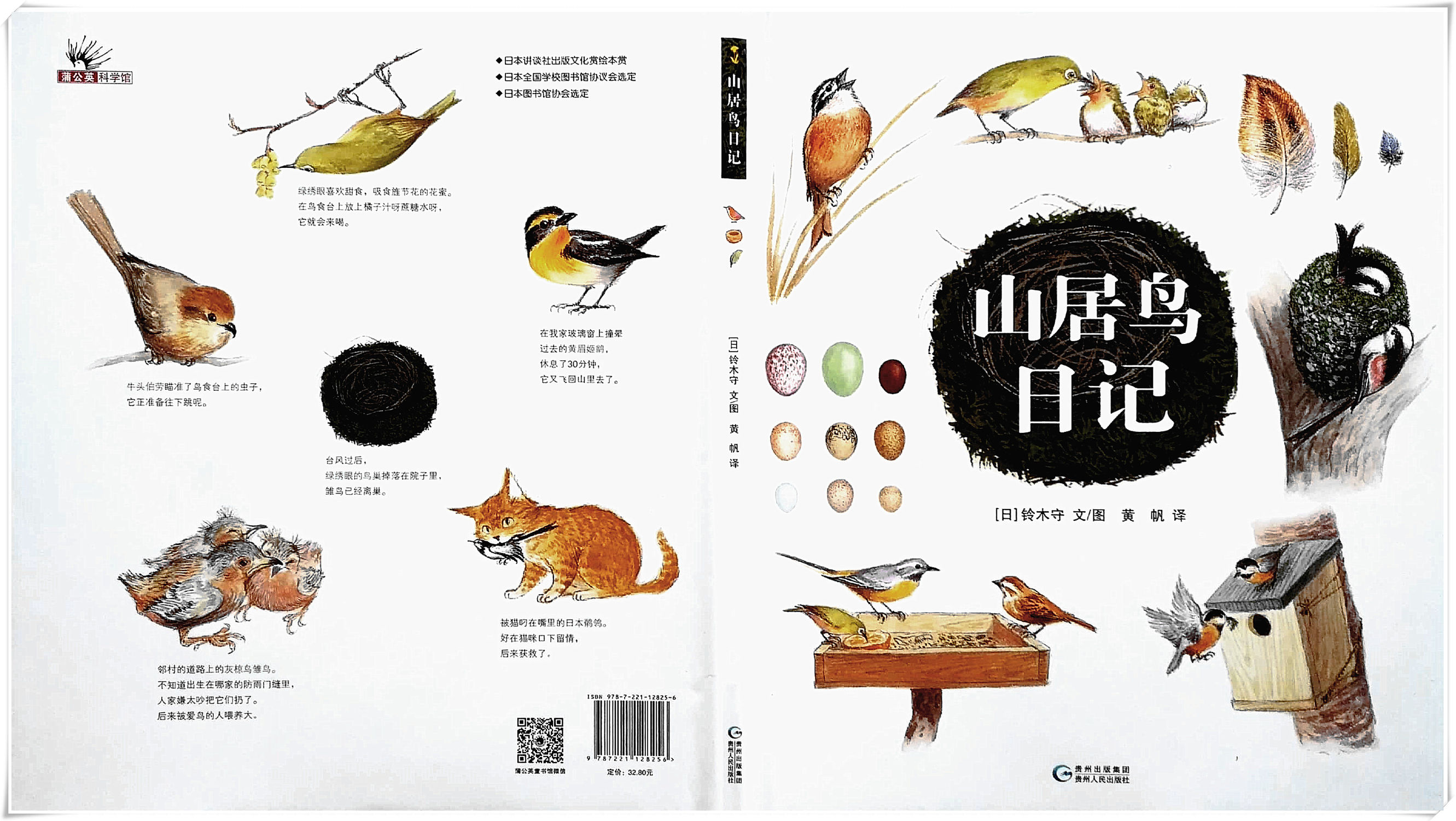 这套科普绘本中的《山居鸟日记》就为我们讲述了作者的深山生活。你看到了什么?看到了鸟蛋、树上的鸟巢,看到了羽毛、妈妈在喂食,看到了山居鸟日记的名字在中间,它的背景是一个鸟巢。每本书的封面都是会说话的,仔细看看这些,看看它们之间会有什么联系。这些图画连起来好像是在向我们讲述鸟的一生。