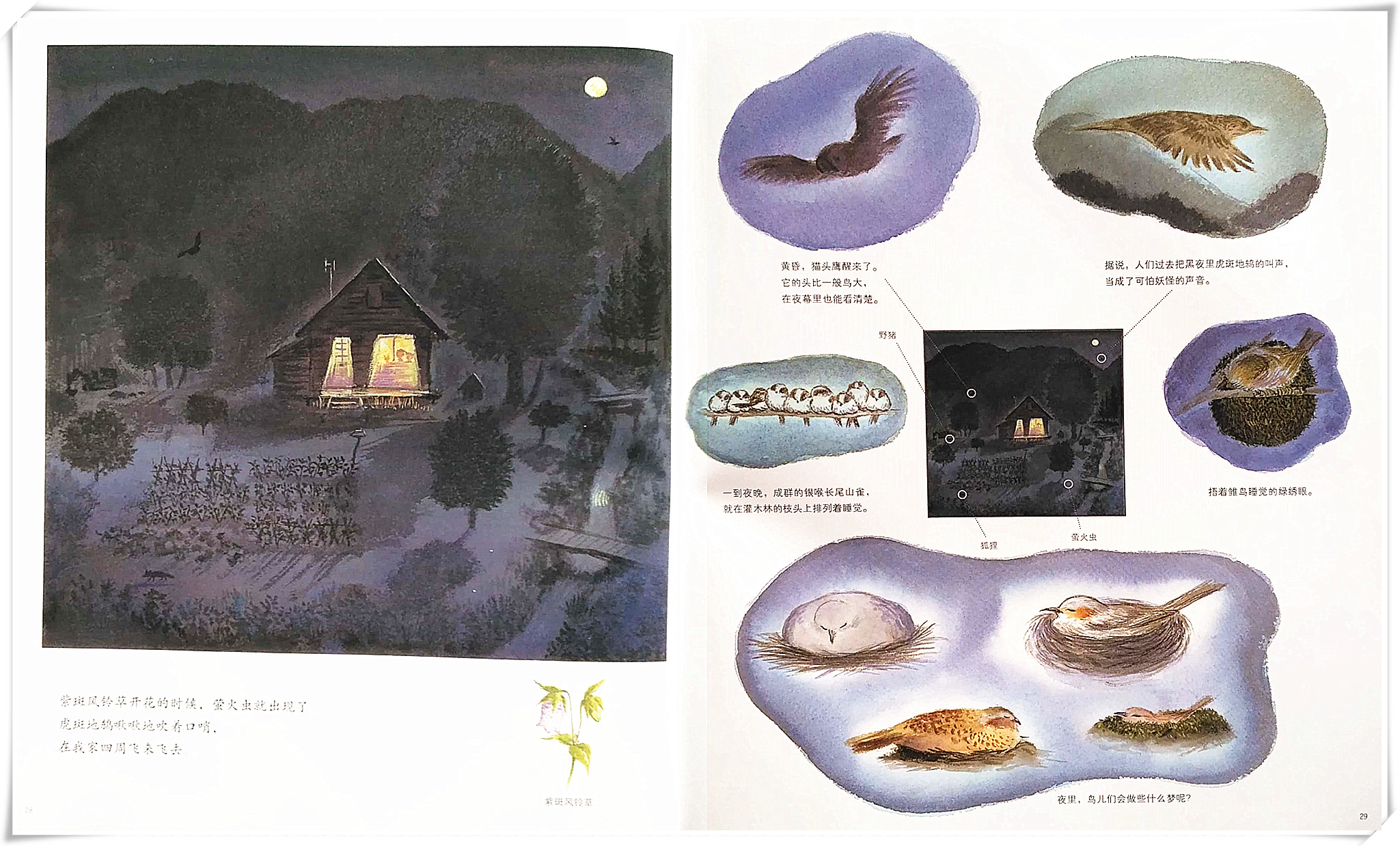 原文:紫斑风铃草开花的时候,萤火虫就出现了。虎斑地鸫啾啾地吹着口哨,在我家四周飞来飞去。