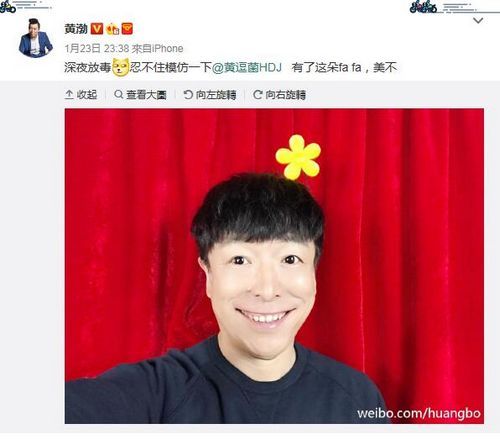 23日深夜,黄渤在微博中晒出一张戴小黄花的图片,并配文:“深夜放毒。忍不住模仿一下@黄逗菌hdj。有了这朵fa fa,美不?”