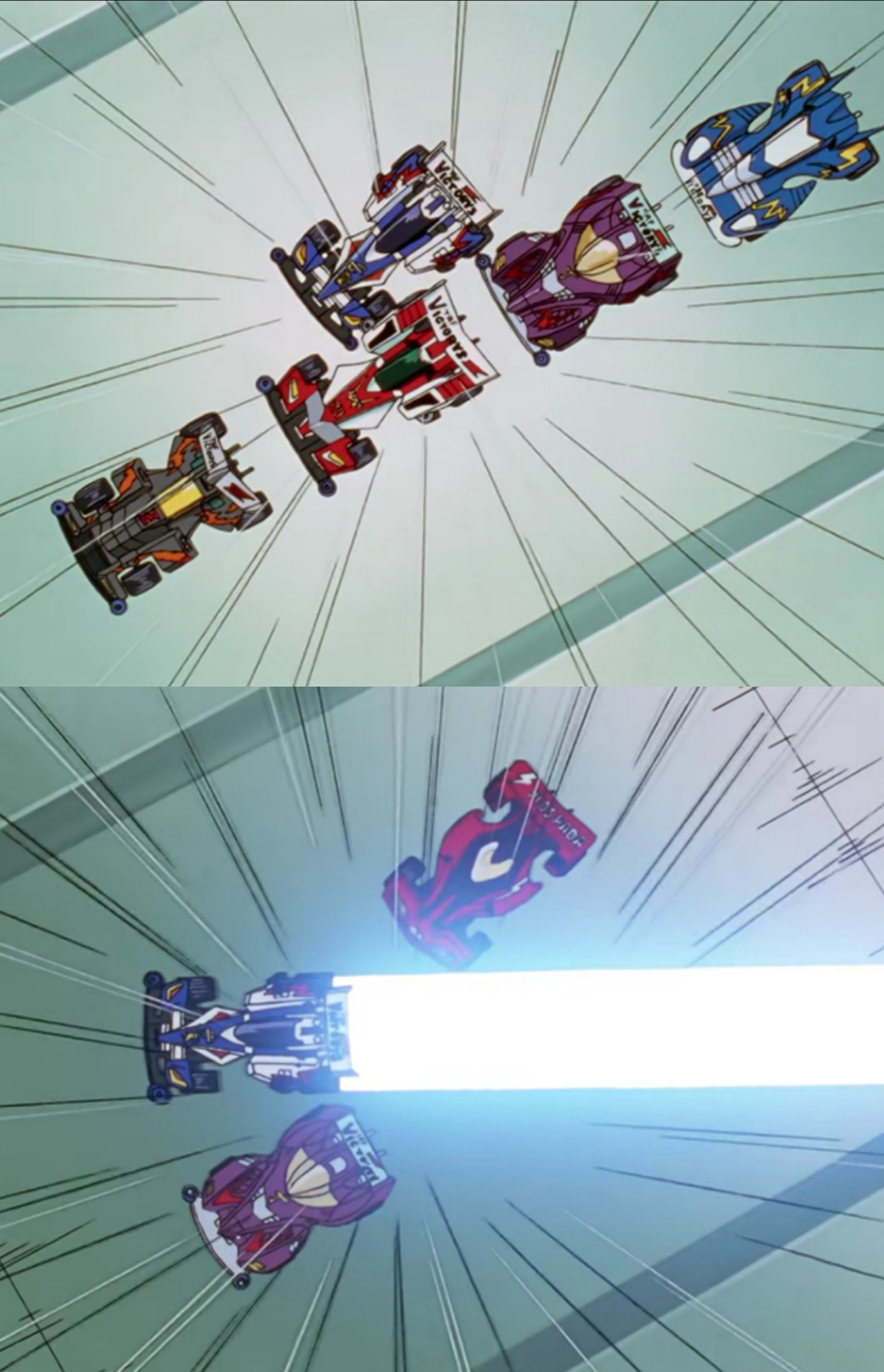 可即便如此,小豪也从不轻言放弃,初次比赛的冲锋号和音速号被淘汰出局,他在明知犯规的前提下依旧将两辆赛车合二为一,坚持跑完全程,就算得不到名次也不放弃比赛。用冲锋音速号合体赛车的车灯在漆黑的比赛场地中照出一道光,为身后的参赛者引路,带着身后参赛的车辆完美的跑回终点。