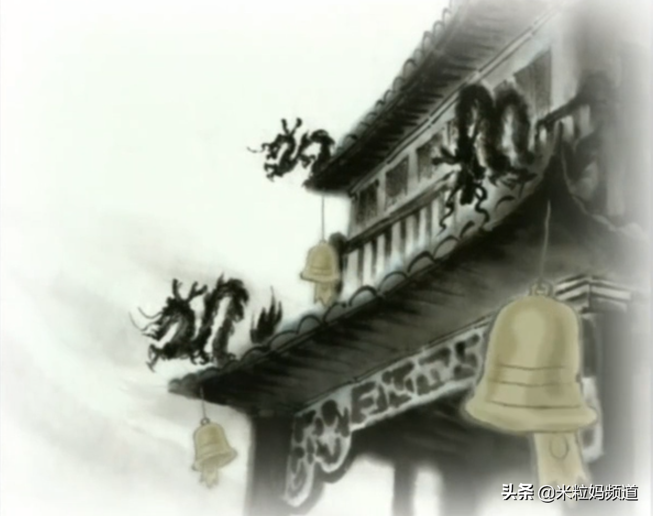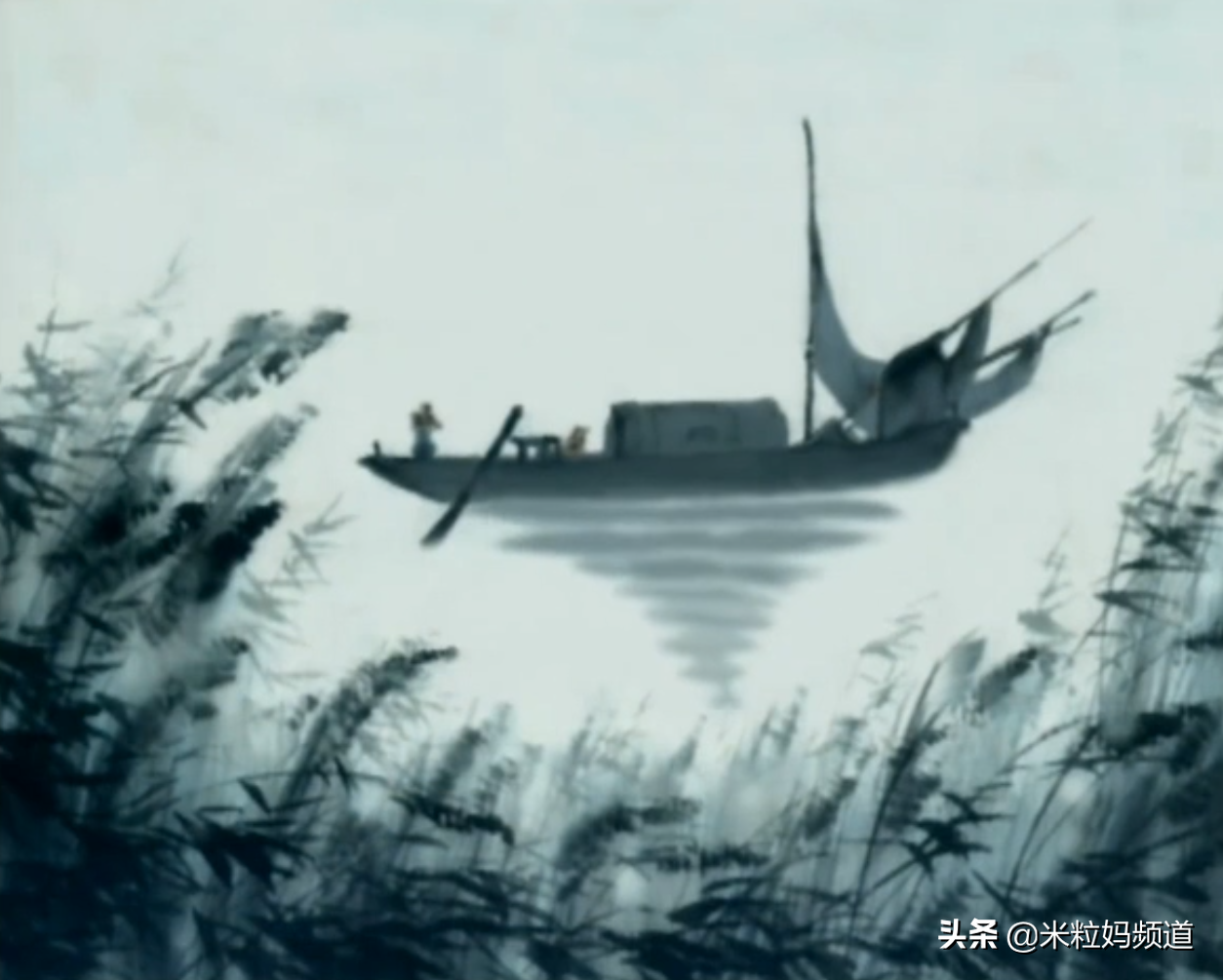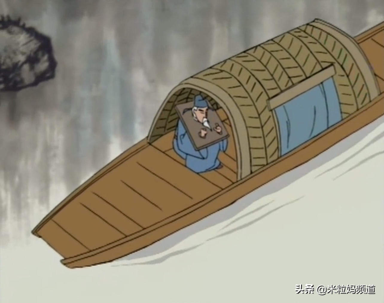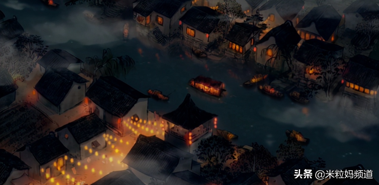 再看看《枫桥夜泊》(月落乌啼霜满天,江枫渔火对愁眠。姑苏城外寒山寺,夜半钟声到客船。)那一集,画面是这样的▼