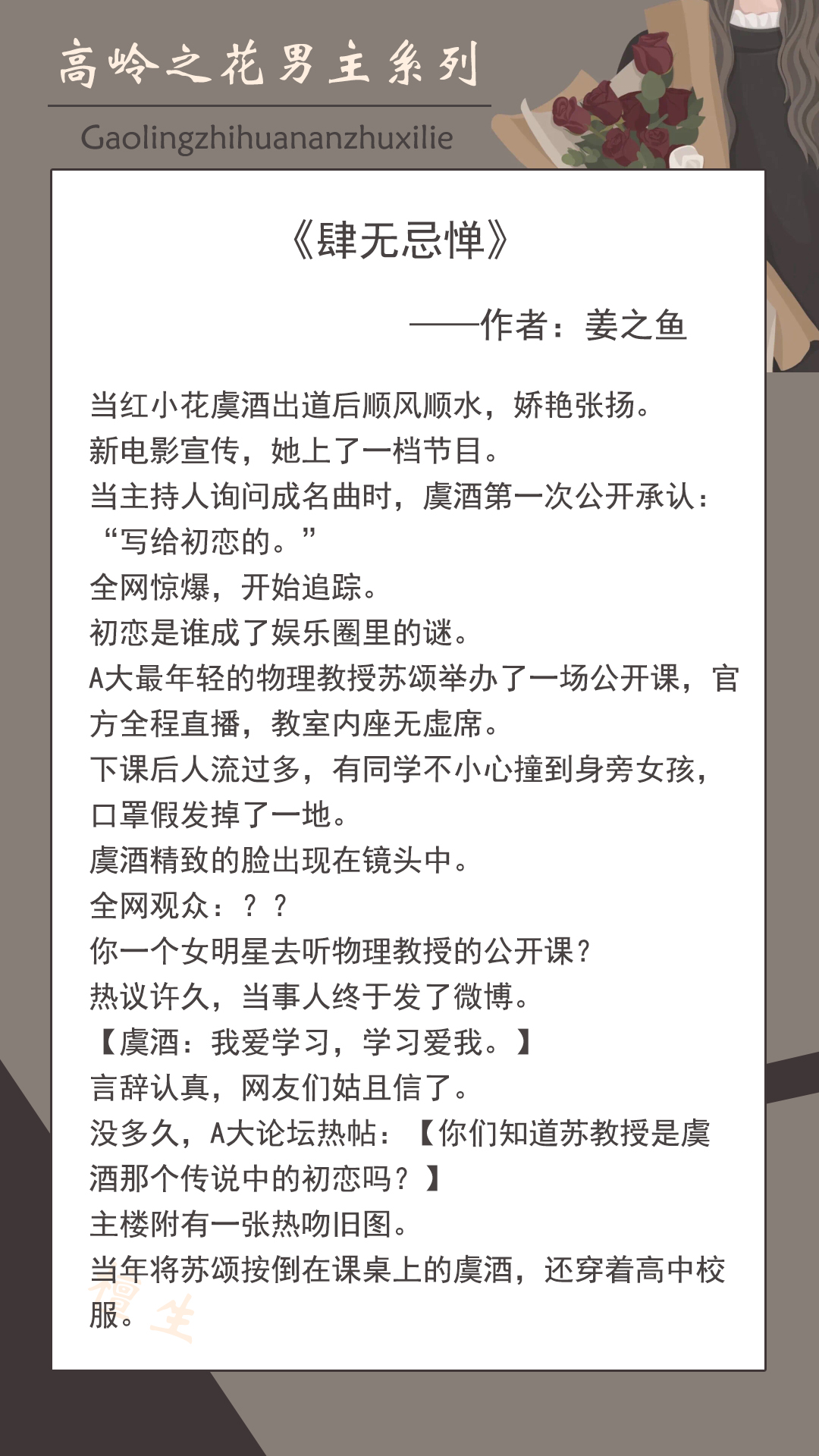 小甜文,女明星和教授设定总让我想到都明俊。男女主谈恋爱相处的同时,穿插着他们校园青春美好回忆。整个剧情流畅,像清风徐来,轻柔入人心。