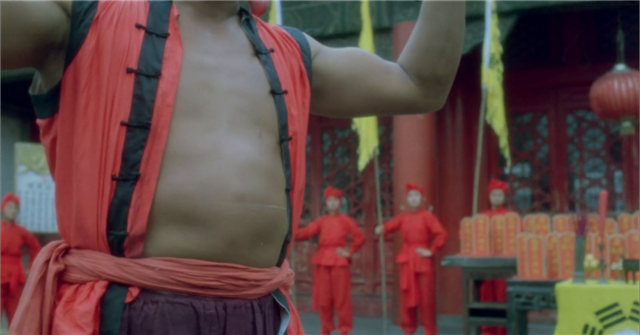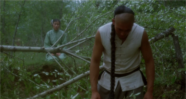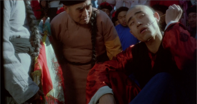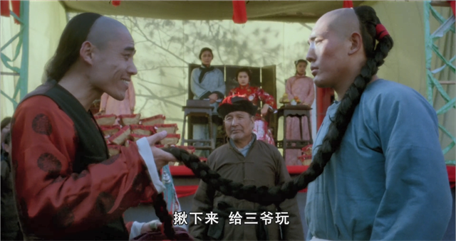 义和团表演“刀枪不入”,在影片中也有体现。大刀砍在胖子的肚皮上,只留下一道白痕。影片中,傻二的辫子依旧是传统的象征,辫子神功多次打败洋人,也是“刀枪不入”类的传统艺能,他也在义和团的集会上进行了表演。