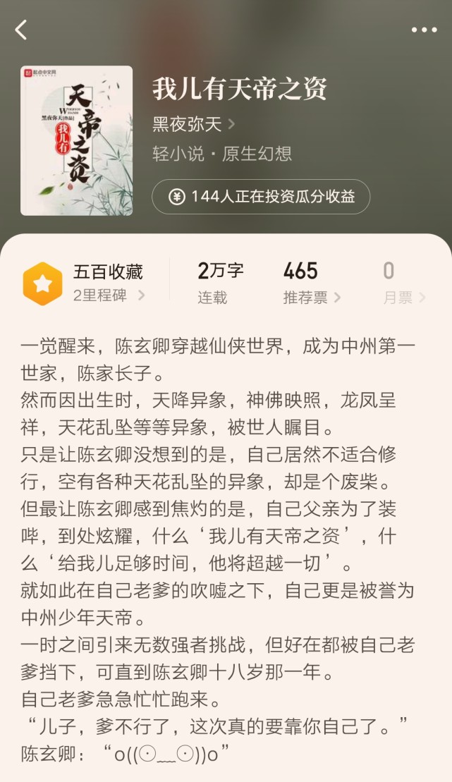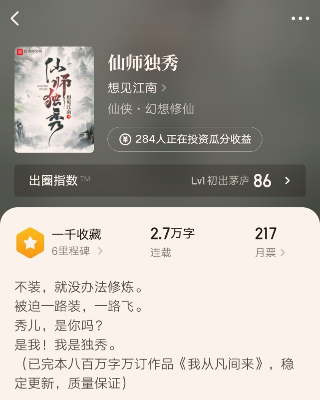 如今新书依旧是仙侠风的轻小说,讲述一个穿越之后空有惊人异象的主角,如何从废柴逆袭的故事。