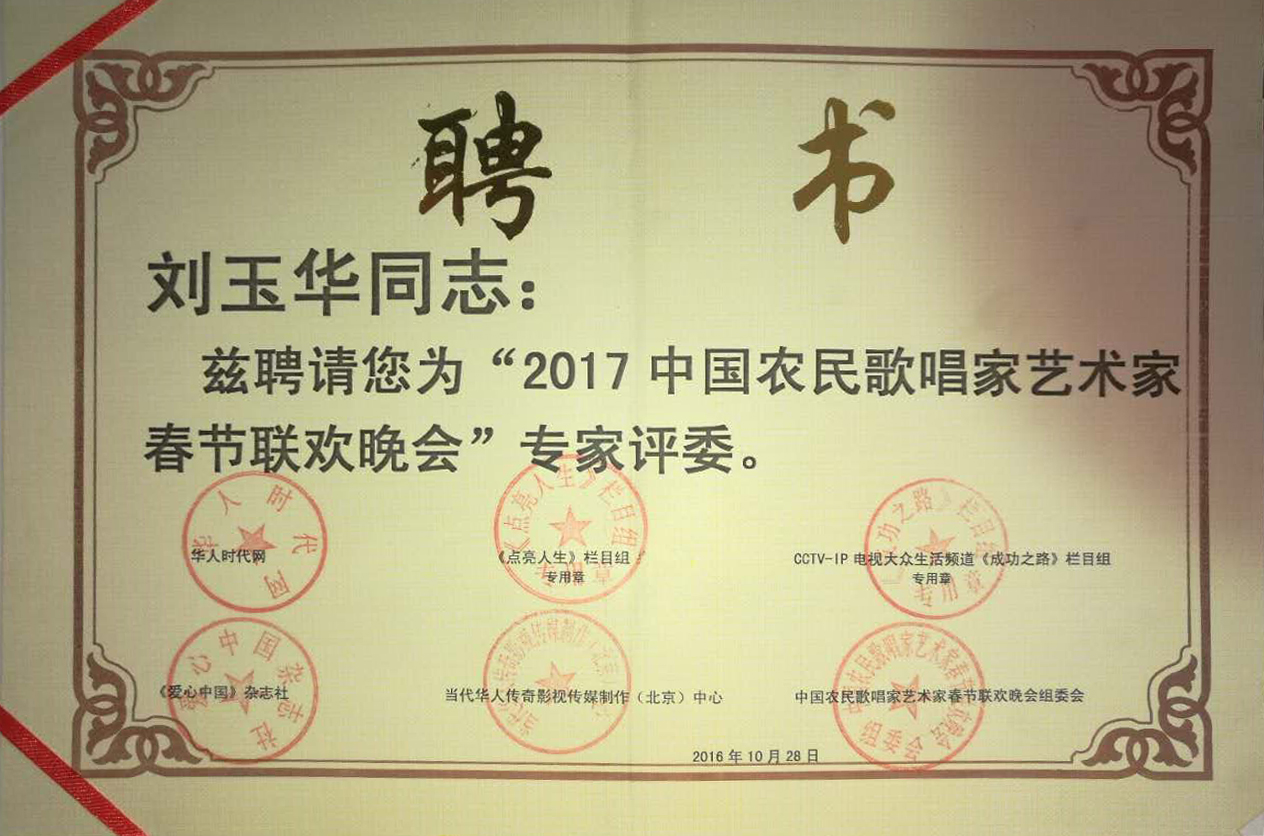 2016年10月,辫子姐刘玉华与我国著名歌唱家朱明瑛老师一起被央视授予“2017年中国农民歌唱家艺术家春晚专家评委”“大众春晚形象代言人”,被中央电视台《成功之路》栏目授予“时代楷模第十二届十三届爱心中国公益大使”称号,多次受邀参加央视和各大卫视的节目录制。