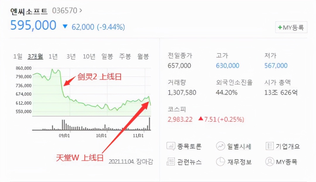 这一次韩国玩家终于是坐不住了,纷纷炎上ncsoft,可以说之前宣传有多香,玩家现在就有多失望多愤怒。这直接导致ncsoft的股价从83.7万韩元左右最低跌落到65万韩元,在短短三天,市值就蒸发了3.5万亿韩元,约合210亿人民币,这是ncsoft近几年来的最低点!