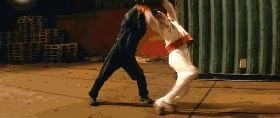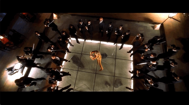 乌玛·瑟曼穿着李小龙经典的黄色紧身衣,手持武士刀以一敌百的场景。