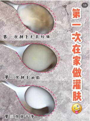先用热毛巾敷脸,把乳液和精华按照5:1混合,把混合物涂到脸上按摩一会儿。然后,重点来了,再用勺子,大力地刮刮刮刮刮……就可以把脸上的脏东西刮下来,让皮肤又嫩又滑。