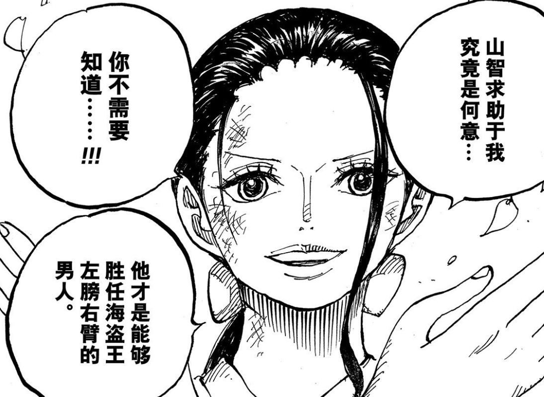 早在1020话,面对黑玛利亚的质疑,身为草帽团成员之一的罗宾自然要维护伙伴的权益,以【海贼王左膀右臂的男人】打脸黑玛利亚看不起山治。