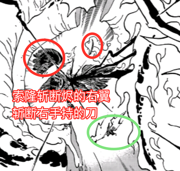 那么,我们再来看看烬被索隆击败后的画面。他的右翼有一部分被索隆的霸王色缠绕的剑气斩断,还有他右手持的刀也发生断裂。