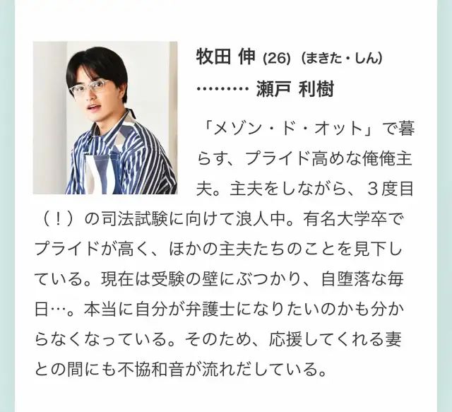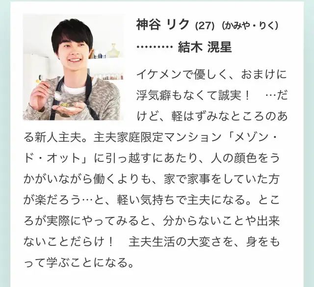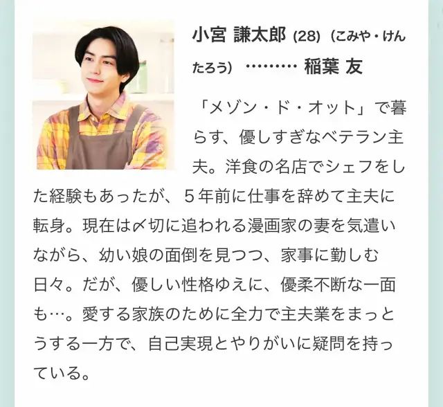 之后,神谷结识了公寓里的另一位家庭主夫——小宫谦太郎(稻叶友 饰)。