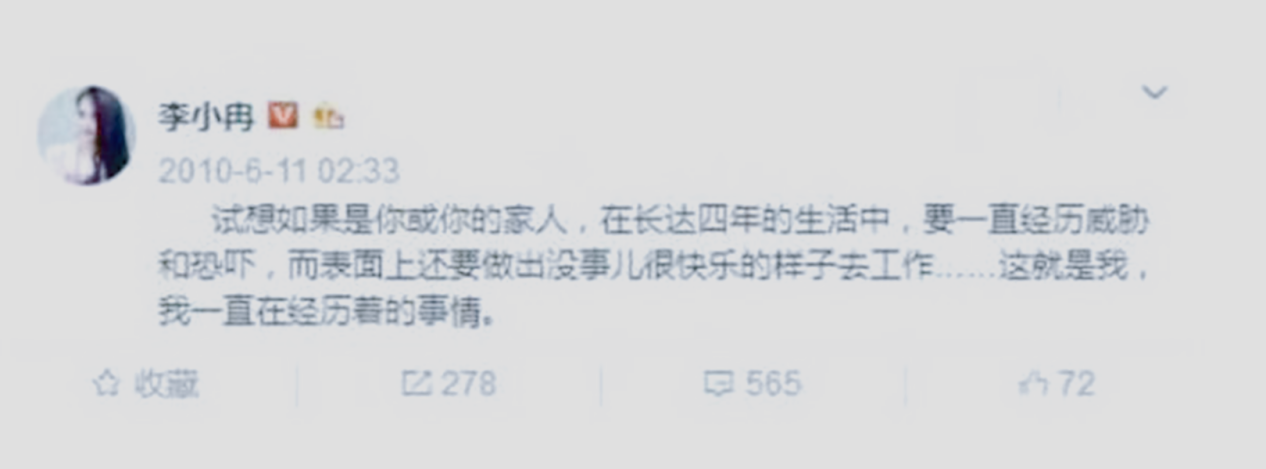 从这些我们可以看出,李小冉不知遇到了什么事,对生活的恐惧有无助。到底发生了什么?