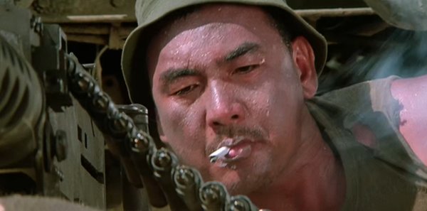 钱嘉乐饰演雇佣队一员阮小川,也是撒个尿就被中枪倒地了。此时钱嘉乐名气还不大,在洪家班一直任武师工作,《东方秃鹰》里镜头也不多。作为武行,钱嘉乐一步一个脚印,他的钱家班已经是香港影坛动作片的中流砥柱。靠的就是敢打敢拼,这次除了洪金宝,《飞龙猛将》里还替身成龙完成高难度动作。