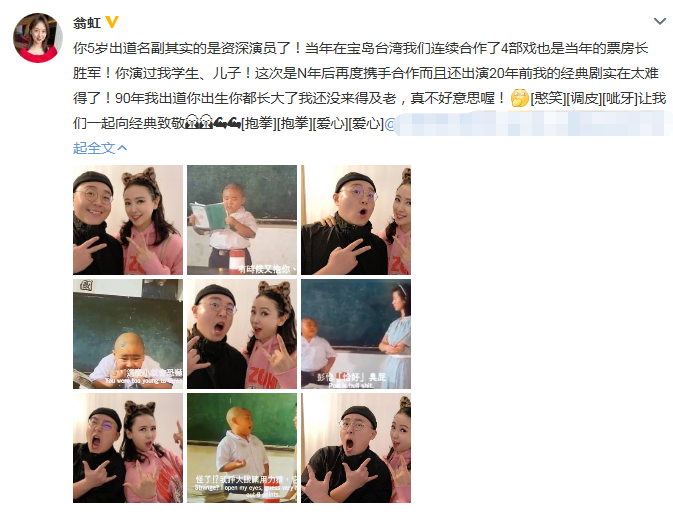 另外翁虹还附上了两人1996年合作电影《狗蛋大兵》的老剧照,声称"90年我出道你出生你都长大了我还没来得及老,真不好意思喔!"语气调皮又可爱。另外还透露两人将再次合作,"这次是n年后再度携手合作而且还出演20年前我的经典剧实在太难得了!"