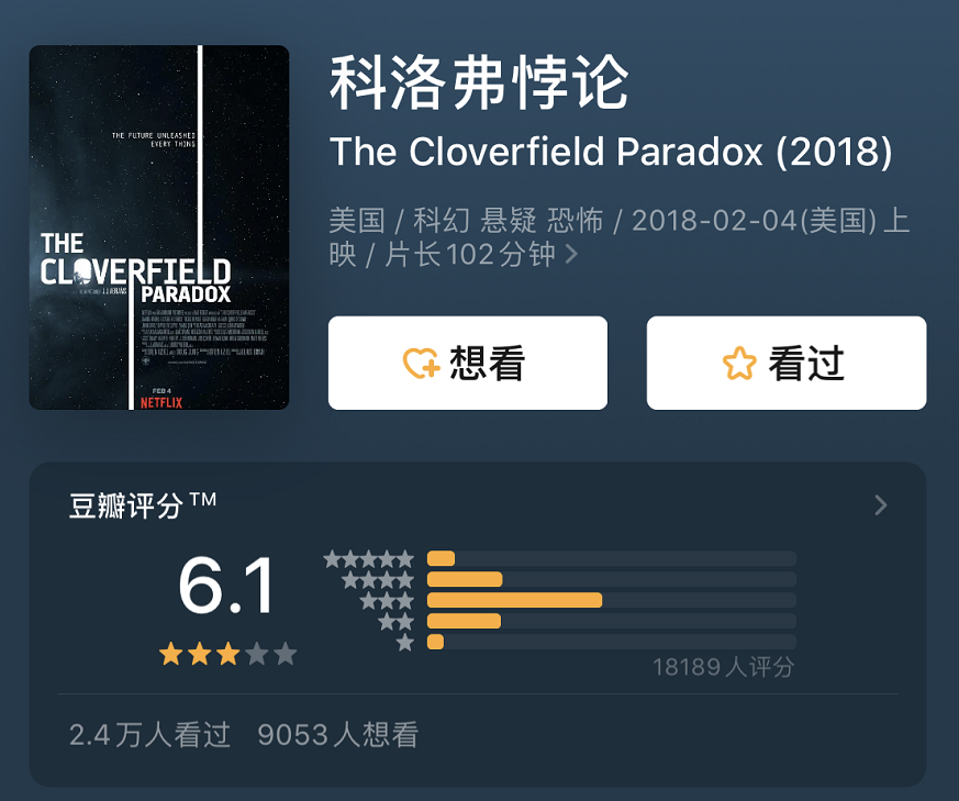 评语:科洛弗系列影片的最后一部,影片整体架构具有浓郁的克苏鲁气息,前面科幻悬疑的味道很重,后面结局很好的将系列三部曲串联了起来。怪兽出现的前因后果也有了很好的解释,虽然不尽如人意。子怡也成功的在国际影片秀了一把中文,虽然最后被冰冰带走了甚是可惜。这里有两个好消息和两个坏消息。1.好消息是中文终于成为星际通用语言了,坏消息是除了子怡的中文其他人的都听不懂 2.坏消息是即使到了另一个地球战争依旧上演,还有个好消息是另一个地球的中国依然能安全撤侨。