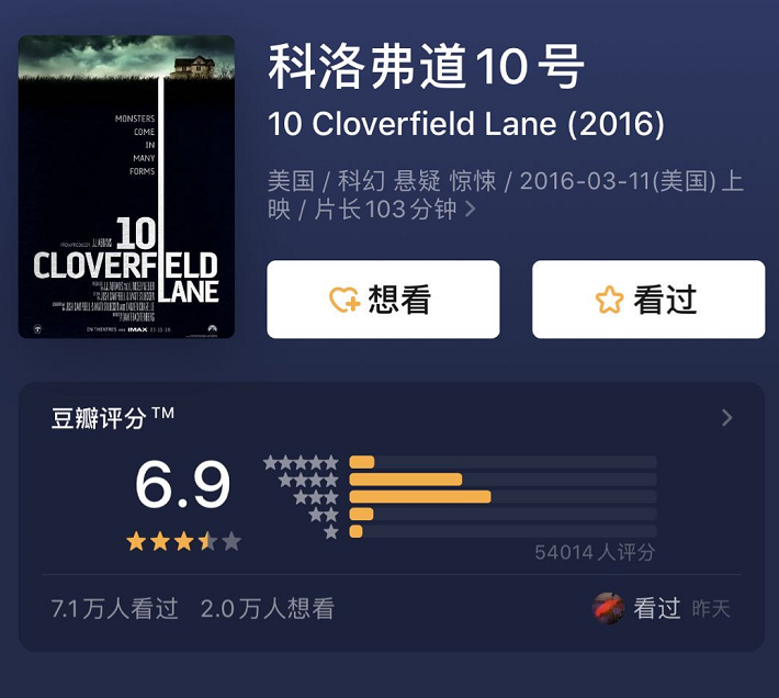 评语:这部电影不看到最后,完全不会跟克苏鲁产生鸡毛点关系。在封闭的环境下,1孤男1寡女1变态,末日传言到底是真是假,看到一半以为猜到了真相,结果还是反转了。前面剧情设置还算精巧,boss 的各种设局让人期待着一波三折,气氛结构还算工整。而且很少有影片让你在觉得"主角傻逼-等下她好像是对的-不对她真的是傻逼"之间不断转换。但是结尾是什么鬼,本来还指望着是给系列电影下一盘大棋,结果嗯是把好好的精致悬疑片拍成了借克苏鲁系怪兽奇幻片。