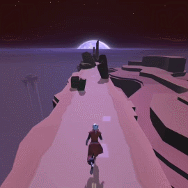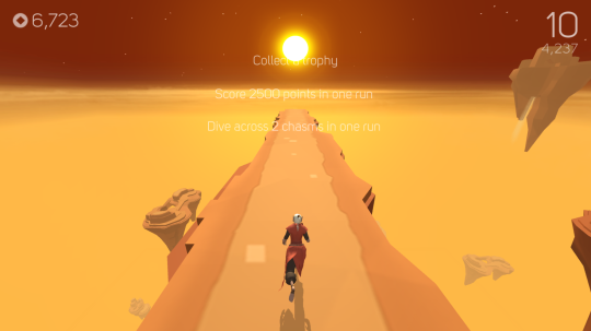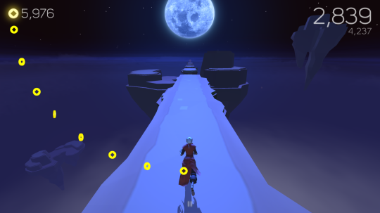 游戏画面方面,人物永远在追逐着背景的太阳和月亮,随着日出日落,周围的亮度也会发生变化再加上漫天繁星营造出一种空灵唯美的氛围,美中不足的是周围环境、跑道和障碍等建模则略显粗糙。