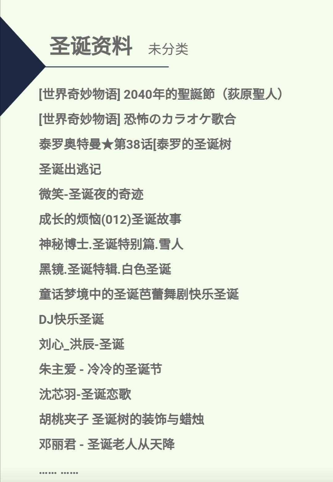 亚瑟·圣诞、克劳斯:圣诞节的秘密、圣诞夜惊魂、极地特快、精灵兰尼和韦恩的圣诞前夜、圣诞精灵精灵总动员、小浣熊42集.快到圣诞节了、圣诞颂歌、 守护者联盟、怪物史瑞克番外篇:驴子的圣诞歌舞秀、 怪物史瑞克番外篇:史先生过圣诞、冰河世纪番外篇:猛犸象的圣诞节、海底小纵队 圣诞节的大惊喜、 巧虎的圣诞节礼物、查理与罗拉第1部08-1 圣诞节还有多久、 消防员山姆第57集 圣诞老人落水啦、猫和老鼠圣诞夜、超级飞侠第四季 (26集)去悉尼送圣诞礼物咯 、圣诞营救计划、极地大冒险2、米老鼠与小气财神欢渡圣诞夜、bbc蓝色小考拉christmas_present、布公仔圣诞奇遇、 拯救大明星、查理·布朗的圣诞节、格林奇是如何偷走圣诞、粉红小猪妹的圣诞节、芭比之完美圣诞节、圣诞老人和雪……