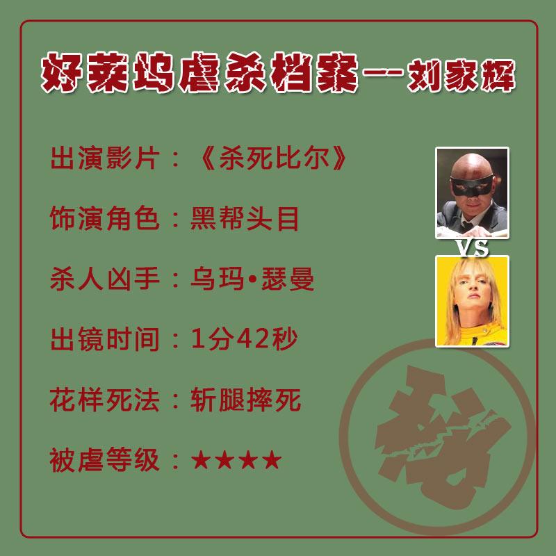 痴迷香港电影的痞子昆丁,自称是刘家辉的铁粉,上面的白眉就是被邀参演《杀死比尔》时的造型。然而昆丁可能怕偶像的戏份不够,又给他在影片中安排了另一个“狠角色”