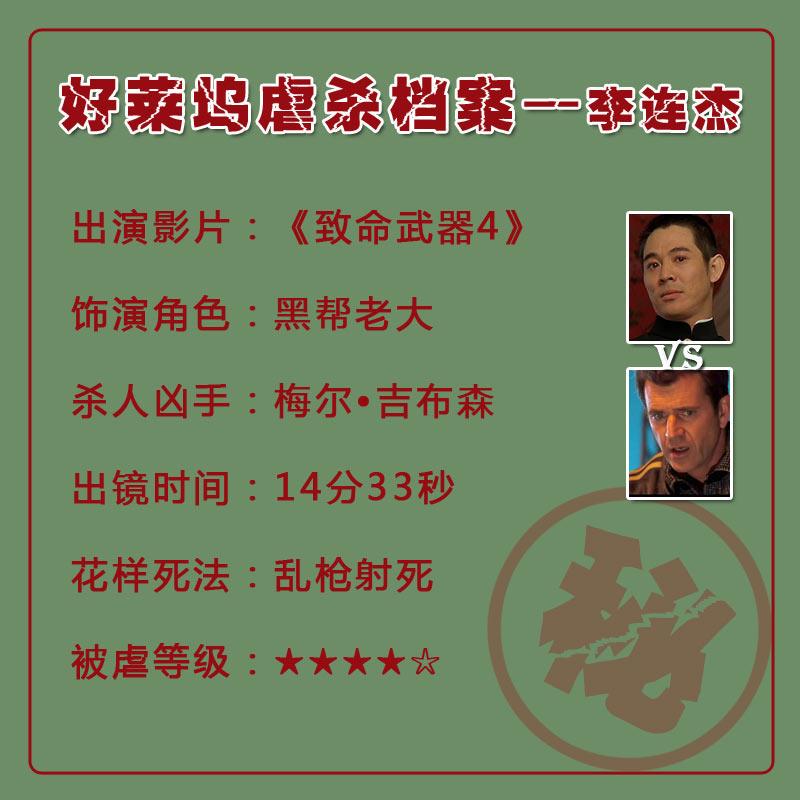 但是为在好莱坞闯出一片天,我们的大英雄也不得不饰演了几次大反派,其中以《致命武器4》中和梅尔?吉布森对手戏,最为令人难以接受。
