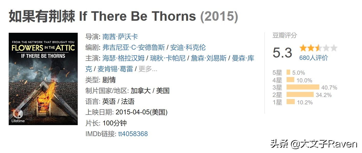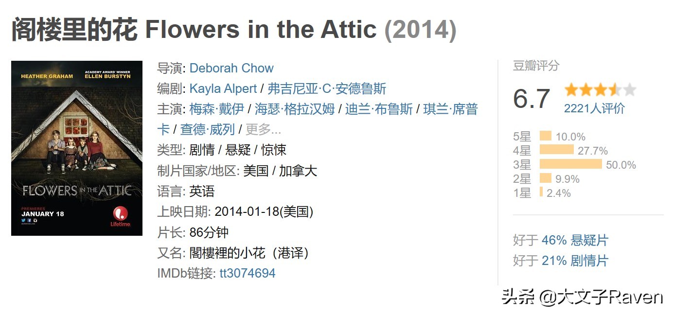 本片根据v.c.andrew备受争议的经典著作改编而成,故事讲述了一个关系复杂情感扭曲的家庭故事。在父亲意外死亡后,自认是花瓶的母亲把兄妹四人带到了祖母的豪宅里,企图获得家族财产。然而祖母的冷酷无情却令孩子们难以忍受、百思不得其解,他们不得不住在狭窄的阁楼里,每天看祖母的脸色生活,然而随着时间的推移,他们才渐渐发现,祖母冷漠严厉的真正原因何在,而这个家庭扭曲复杂的情感关系也仿佛像一个魔咒缠绕着他们青春悸动的心。