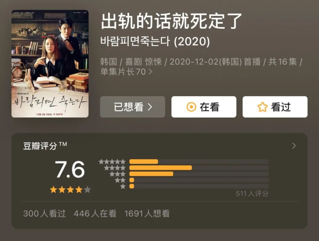 那在这个周五荐剧夜,我想带大家一起看看满足以上两个条件,且刚出不久的韩剧《出轨的话就死定了》。