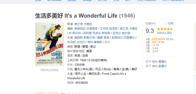 《生活多美好》于1946年12月20日在美国上映,是一部很老很老的黑白电影,从上映至今,感动过数以亿计的观众,在豆瓣电影里的评分高达9.3分,在励志类电影里排名第一。甚至有很多观众表示,五星并不能代表自己的对这部片子的喜爱,如果可以,它应该是十星。