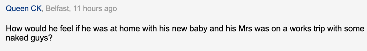 “如果是他在家里带孩子,他老婆在外面和几个裸男一起出差,他会怎么想?”