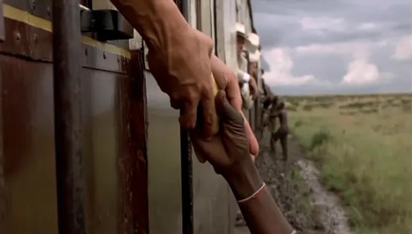 影片的结尾,捷特在火车上看到一个卖香蕉的肯尼亚妇人,她对妇人说:“我穷得像一只猴子”,而妇人却给了她一根香蕉并说“那就把这根香蕉给猴子吧”,两人握着手相视一笑。在这里,这不仅仅是香蕉,还包含着肯尼亚给予他们的一切,理解、宽容、爱、家的归属感以及永远的记忆。一家人坐着车远去时,我们知道,家就在前方,他们已经找到了它。