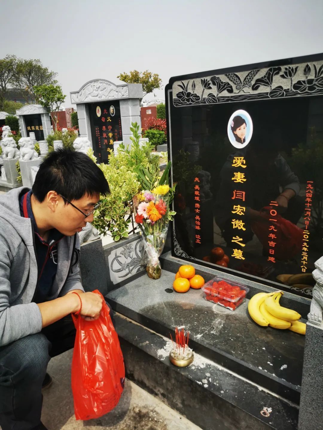 初春的墓地树木葱葱。平时这里一辆车都没有,偶尔看到一条狗。打开一个尼龙袋,掏出抹布,吴载斌把墓碑里里外外擦了一遍。纸钱面额很大,他一次烧很多。以前微微没过上好日子,都是抠抠搜搜的,到那边就是使劲花,买衣服、买包。香也点上一把,微微爱热闹,他想着是代表很多朋友来看她。