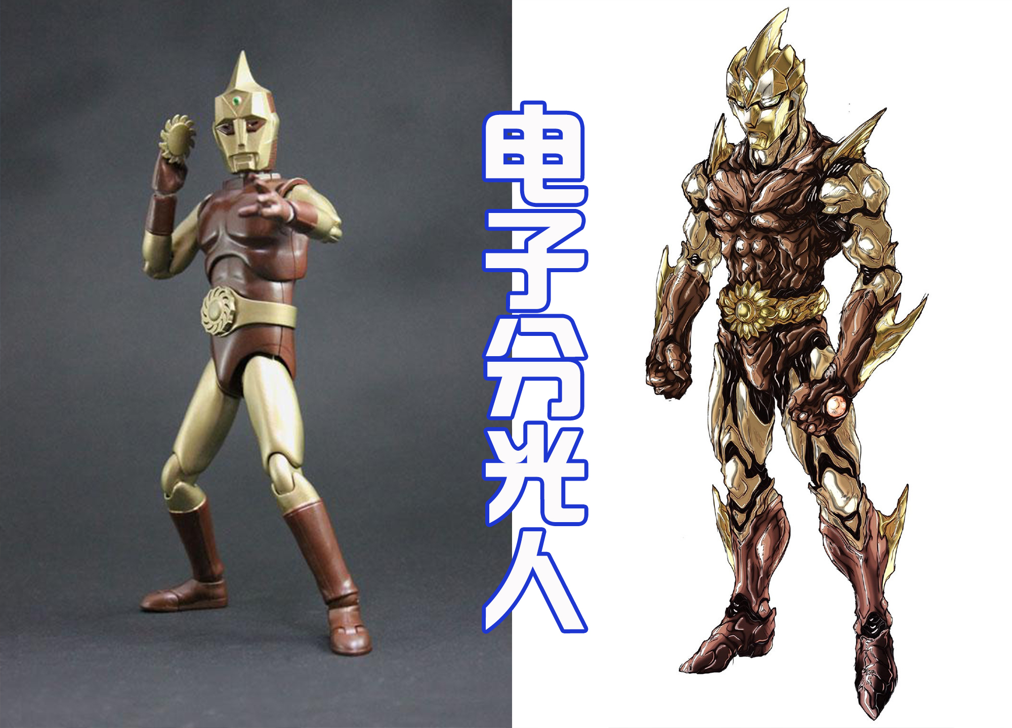 这个是电子分光人,也是一部非常古老的特摄英雄。电子分光人也被称呼为宇宙猿人。电子分光人的原版造型有点有趣,是一个非常简陋的特摄人物。有着瘦弱的机械身材,其中一只手掌能够切换成电锯的造型!而后藤正行版的电子分光人就比较威武雄壮一点,身体上的肌肉感很强,同时肩膀和手臂、腿部都出现了倒刺,看起来是非常帅气的!