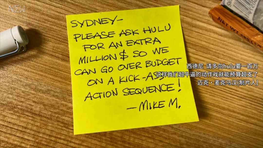 (制作人)西德尼:你能不能向hulu再要一百万的预算,这样我们就能大手笔打造超级炫酷的战争场面了。——麦克(编剧)
