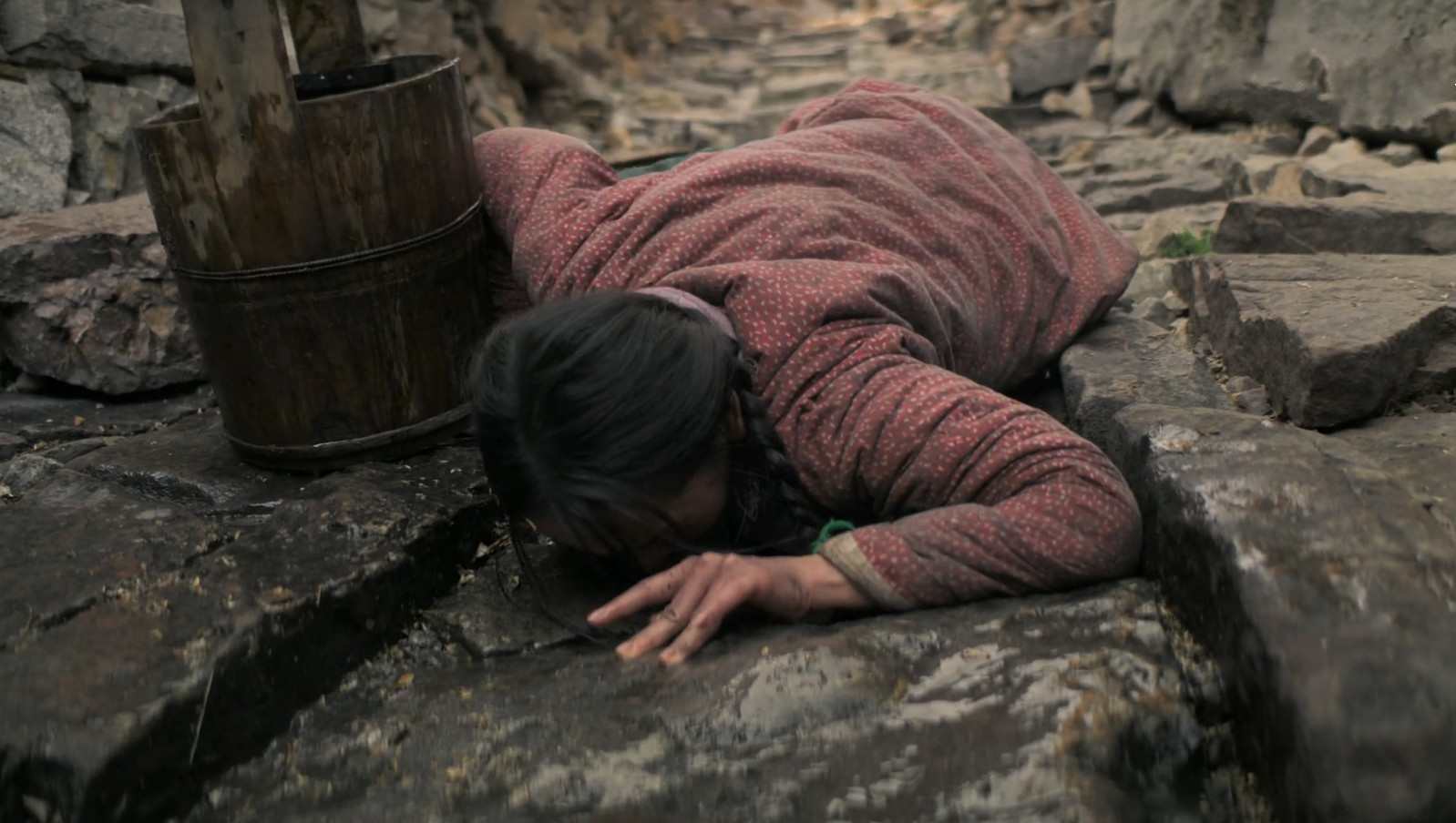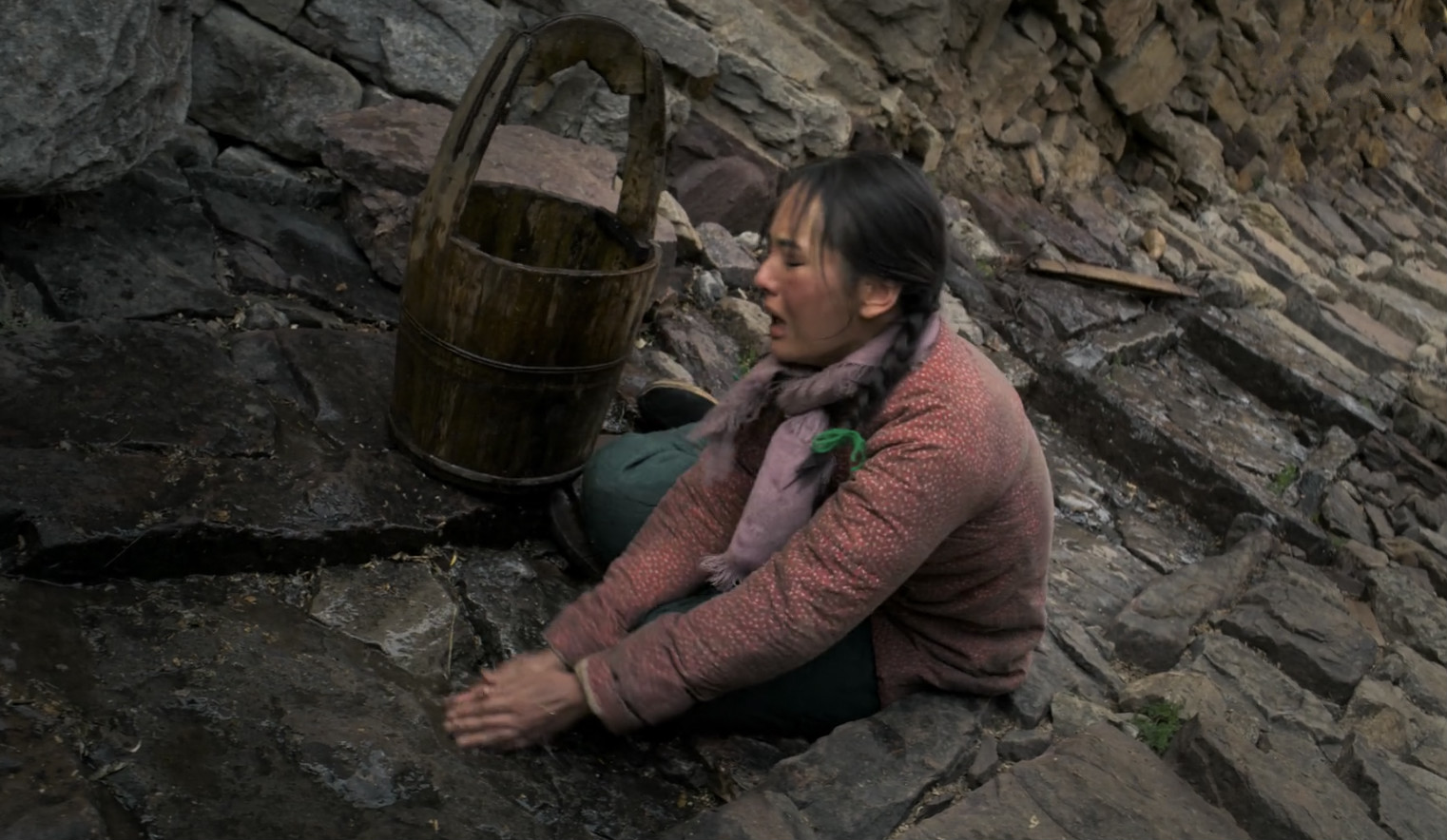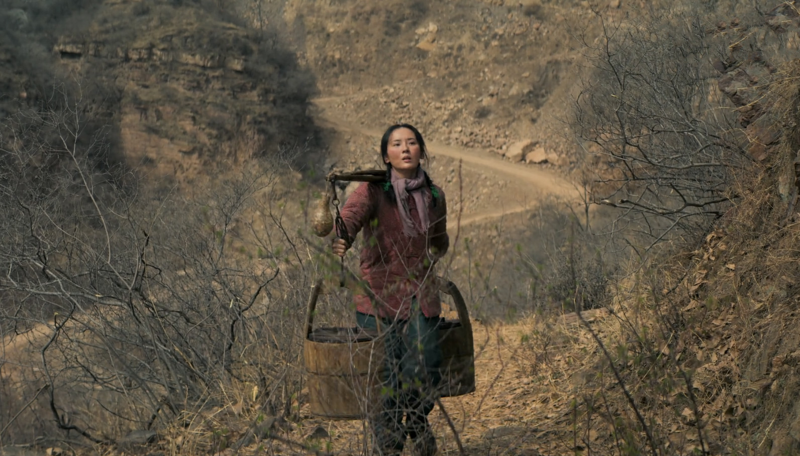 影片开头一个女人挑着水桶,走在蜿蜒曲折的山路上去挑水,画面中丝毫看不到她能在哪里能找到水源?周围不是枯树,就是漫山悬崖峭壁,还有因太过干燥随风飞扬的灰尘。