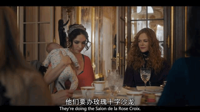 画面一转,grace去参加儿子学校家委会组织的下午茶.。太太们谈论着夏加尔和大卫·霍克尼的展览,就在此刻,一言未发的新入会少妇elena突然大庭广众之下脱掉上衣,毫无避讳地给自己怀抱着的小女儿喂奶,直接给在座的太太们来了一个“见面礼”。