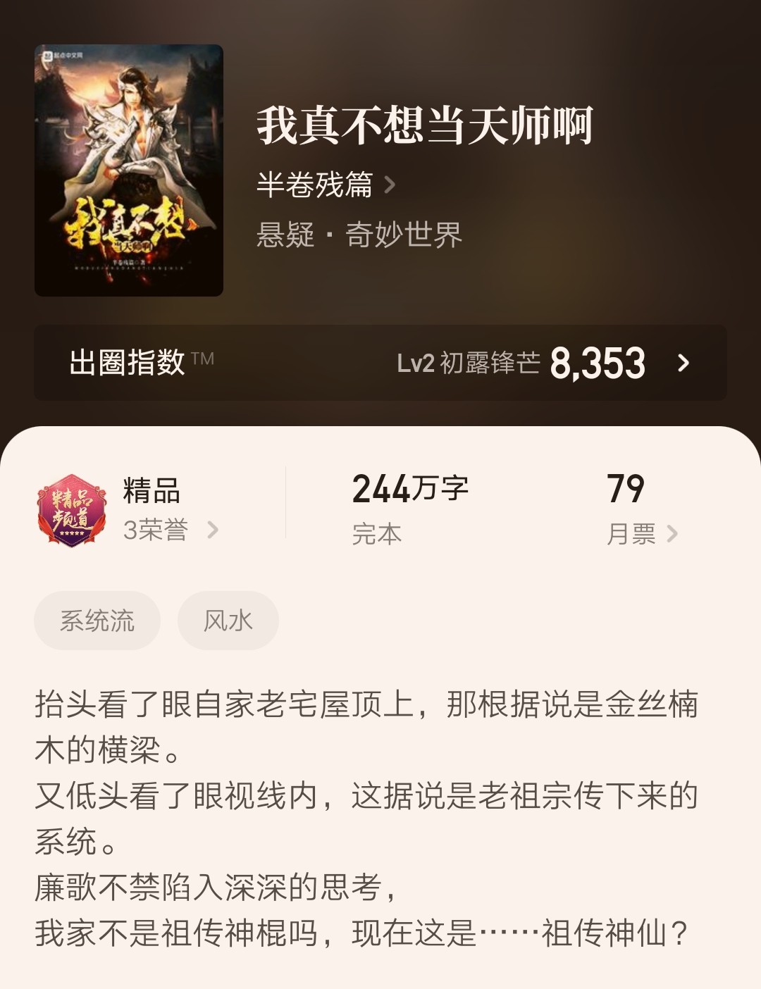半卷残篇的作品,风水类小说。主角继承了祖辈制作的系统,然后在风水天师的道路上一路狂奔了。