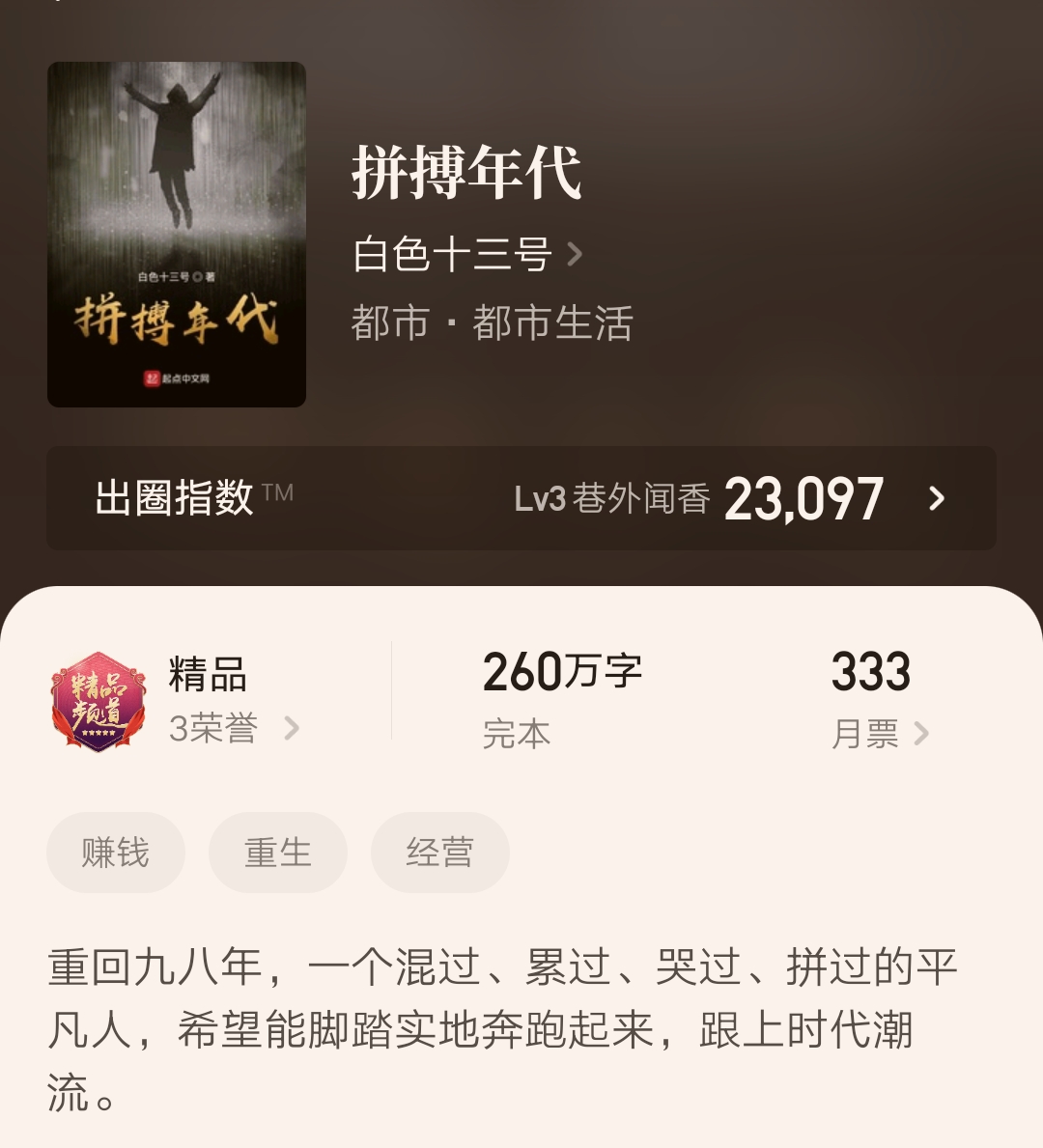 为了安心休养,他停更了这部小说,等到他身体逐渐恢复,再回头的时候,这本小说人气早已经严重流失了。最后他选择了免费更新,给这本小说画上了句号。