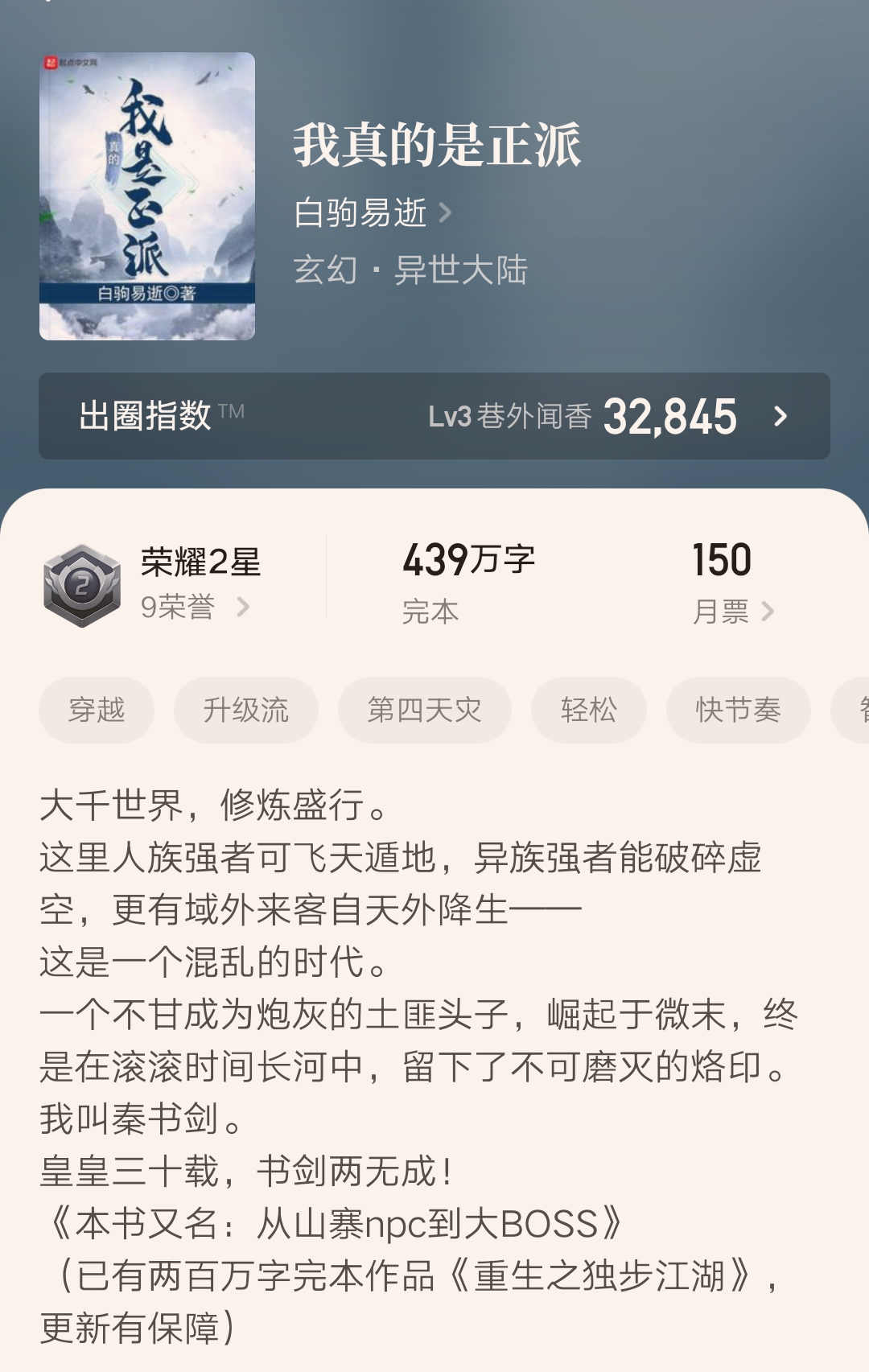 小说属于npc类型的加点流玄幻升级文,主角带着属性面板穿越成了一款游戏里的山匪npc,然后利用这个外挂一步步升级,最终成为了其中的大boss。小说前期偏武侠一些,看着还不错。有兴趣的可以看看。