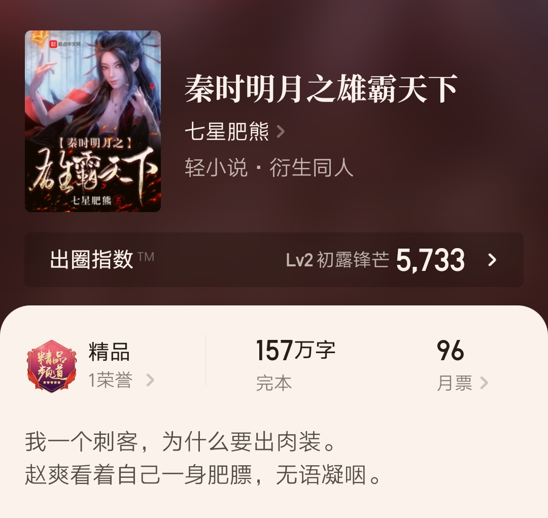 七星肥熊的作品,国漫《秦时明月》的同人小说。在起点这类小说还是很小众的,而国漫同人能写出成绩的也一直就不多。不过这个作者几年前就写过一本秦时明月的同人,成绩也是精品,还是颇为厉害的,书名《秦时明月之大反派系统》。