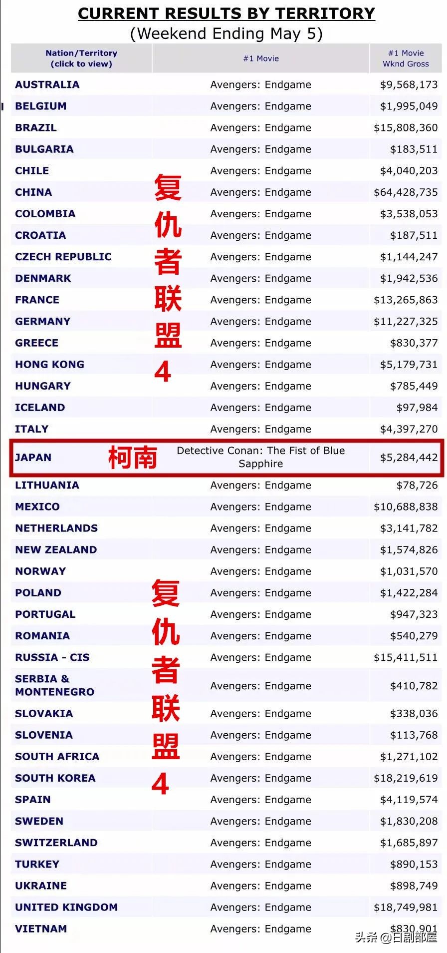 ▲2019年的《复联4》上映首周全球主要电影市场的票房冠军,日本院线最为特别