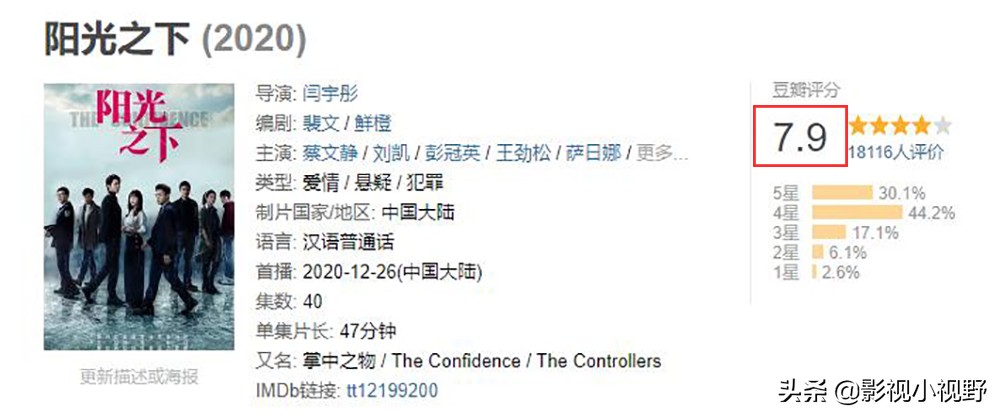 《阳光之下》豆瓣评分7.9,在如此严格的豆瓣评分下,这个分数很不错。不知道后续剧集播出后,分数会不会有变化。