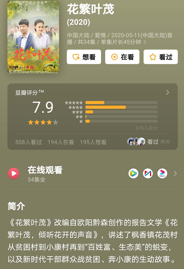 《花繁叶茂》讲述了第一书记欧阳采薇与村主任唐万财、石晓峰书记等人的带领下,让花茂村脱贫致富的故事,由王迅、邵峰、尚大庆、朱墨等实力派演员出演,将接地气又立体的农村人物塑造的淋漓尽致,观众看得也津津有味。