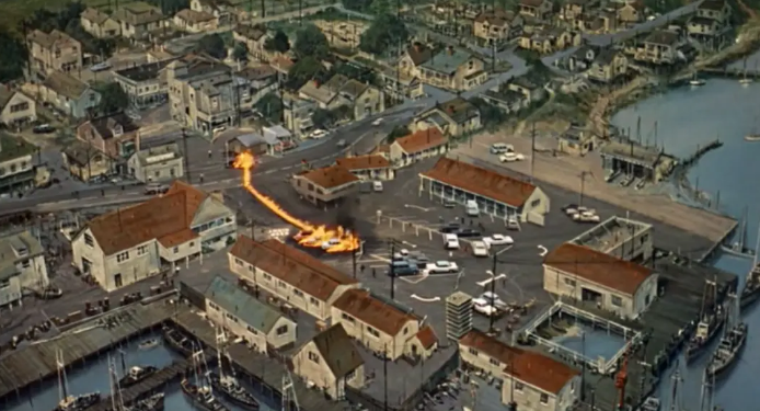 影片中的空间往往是人物被困在一个封闭的场所,所以电影的背景是在一个小镇上,而剧情设置无法轻易逃离的原因:一个是像海边这样的地理环境相对封闭;二是群鸟在镇上的天空聚集,随时都有可能被攻击而丧命。