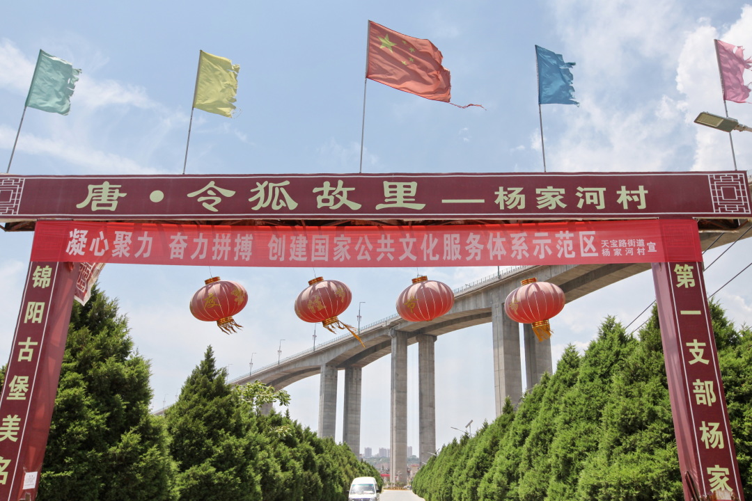 手机导航上查不到令狐德棻墓,故我们先开车到达了耀县县城。进入城中,一路上停车问过多人,都问不到具体的方位。后来从一位快递员那里打听到了前行方向,而后驶入华原街,穿过一个新做的水泥牌坊,再前行两公里驶出了县城。在一条河旁,李欣宇从一个卖西瓜的妇女处打听到了杨家河的方向,而后沿着河边之路驶向一座高高的大桥,在桥的下方无意间看到一个简易的门楼上写着“唐·令狐故里——杨家河村”。众人欢呼找对了地方。继续前行不远,见到了一座不大的水泥桥,停车于此打问路径。我看到旁边的介绍牌上写明此河名为沮河,不知道古人为什么起出这样的河名,显然我们找对了目标,心情一点都不沮丧。